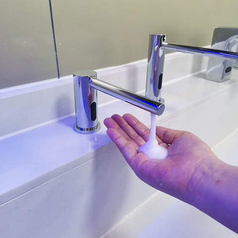モダンスタイル自動ハンドソープ発泡ディスペンサー電池式デッキ取り付けタッチレスクロムブラス1000ml容量